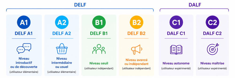 Le DELF (Diplôme d’Études en Langue Française) correspond aux niveaux A1, A2, B1 et B2.