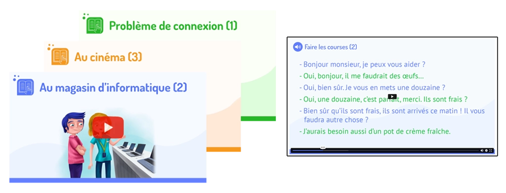 - 60 leçons avec une vidéo/audio par leçon. Chaque vidéo vous permet d’explorer un thème en rapport avec la vie quotidienne pour apprendre énormément de vocabulaire et d’expressions très utiles. À travers des dialogues dont VOUS serez acteur, vous progresserez rapidement de manière ludique et concrète !