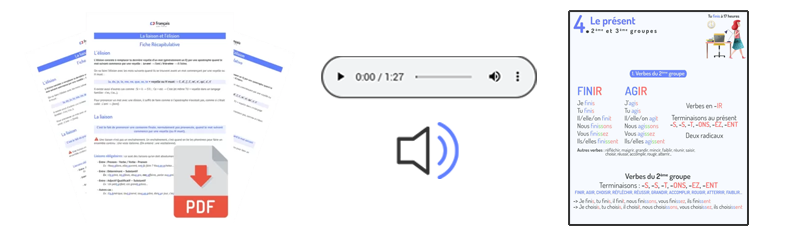 - Des fiches PDF qui résument l’essentiel de chaque leçon ainsi que des exercices sous forme de fichiers audio que vous pouvez télécharger !